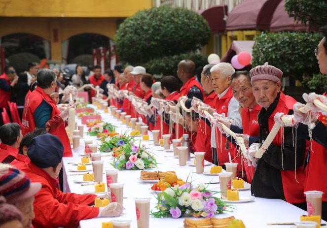 重庆:养老院摆长桌面条宴迎重阳